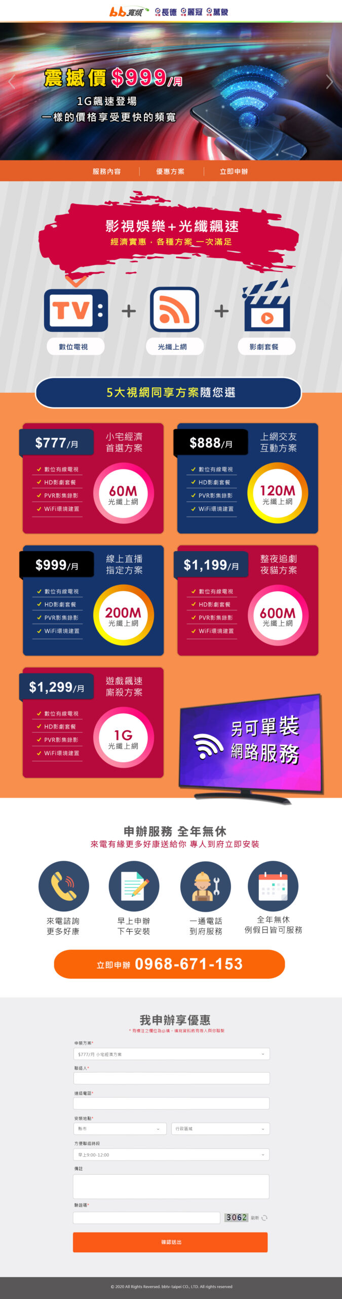 中嘉BB寬頻上網 Wrodpress架站 | RWD 網站設計 專為中嘉BB寬頻上網製作的一頁式 Promotion Landing Page,並採用Wordperss架站。 網址: http://bbtvtaipei.com.tw/ Role: RWD 網頁設計,Wrodpress架站